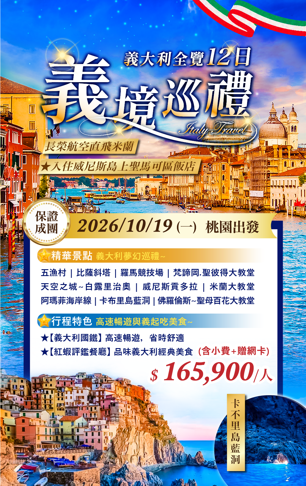 搭乘長榮航空,直飛義大利米蘭~入住威尼斯島上聖馬可區飯店~卡不里島+藍洞+水翼船
